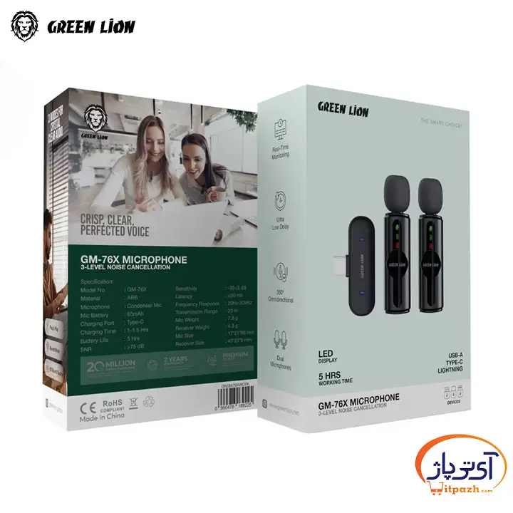 این محصول، با درگاههای اتصال سهگانه خود (USB-C، لایتنینگ، و USB-A)، یک راهحل جامع و همهکاره برای تولیدکنندگان محتواست که با دستگاههای مختلفی کار میکنند. میکروفون GM-76X گرین لاین با طراحی بیسیم یقه ایی، آزادی حرکت را فراهم کرده و با وجود ابعاد کوچک و وزن ۲۰ گرمی، تجربهای حرفهای در ضبط صدا ارائه میدهد. این محصول در بازار تجهیزات جانبی موبایل و کامپیوتر، بهعنوان یک میکروفون دوگانه (شامل دو فرستنده و یک گیرنده) با قابلیت حذف نویز سهمرحلهای، جایگاهی ویژه بهعنوان یک انتخاب هوشمند برای بلاگرها، مدرسین و خبرنگاران به دست آورده است.